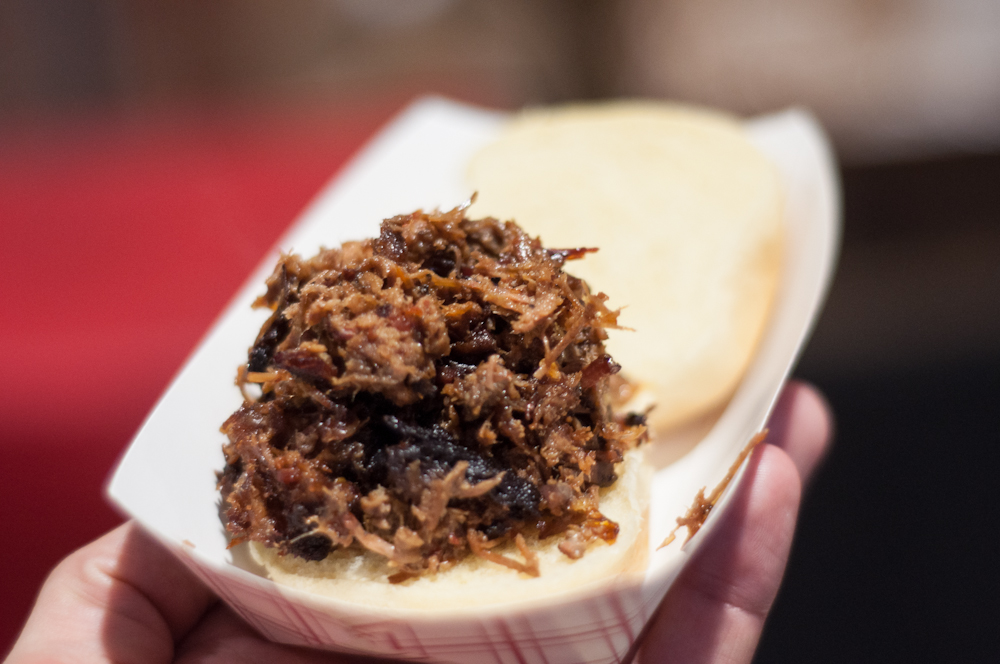 Of course, all this beer and no food would not be a good idea. Intermittently, we had some delicious (also salty and fatty and probably terrible-for-you) barbecue and barbecue-adjacent foods. First up was a solid chili and jalapeno corn bread with bacon jam. The bacon jam was surprisingly addictive! The most guilt-inducing thing had to be the bacon buffet...6 different kinds of bacon, flavored with everything from pepper to bourbon to rum. On my way to the event, I listened to a podcast about the recommended daily intake of sodium, and it's a safe bet that one mouthful of bacon would have put me over the limit. That's not to say it wasn't tasty, though; I gobbled down every last bacon strip. Yes, incredibly salty, but also a guilty pleasure.